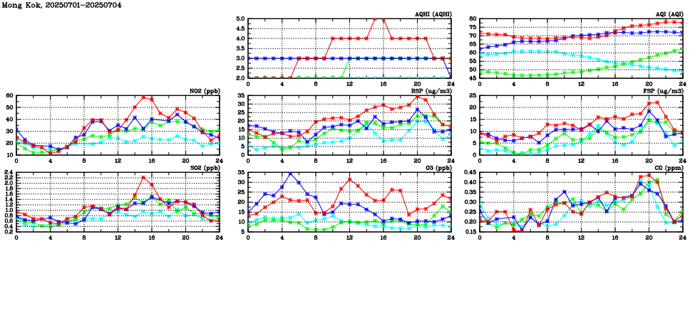 | Air Quality Data Time Series in Mong Kok (2025/07/04) | ( Line colors: Day -3 Day -2 Day -1 Current day ) | 2D Map Current AQHI |