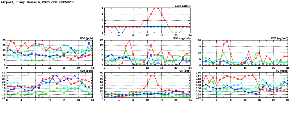 | Air Quality Data Time Series in Airport, Pump House 5 (2025/07/03) | ( Line colors: Day -3 Day -2 Day -1 Current day ) | 2D Map Current AQHI |