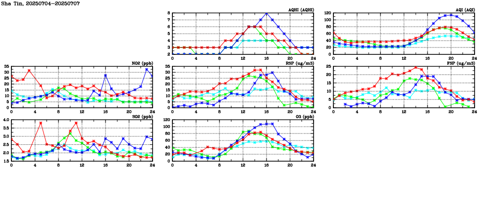 | Air Quality Data Time Series in Sha Tin (2025/07/07) | ( Line colors: Day -3 Day -2 Day -1 Current day ) | 2D Map Current AQHI |