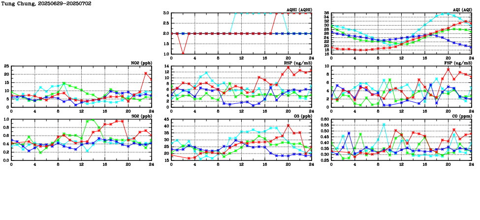 | Air Quality Data Time Series in Tung Chung (2025/07/02) | ( Line colors: Day -3 Day -2 Day -1 Current day ) | 2D Map Current AQHI |