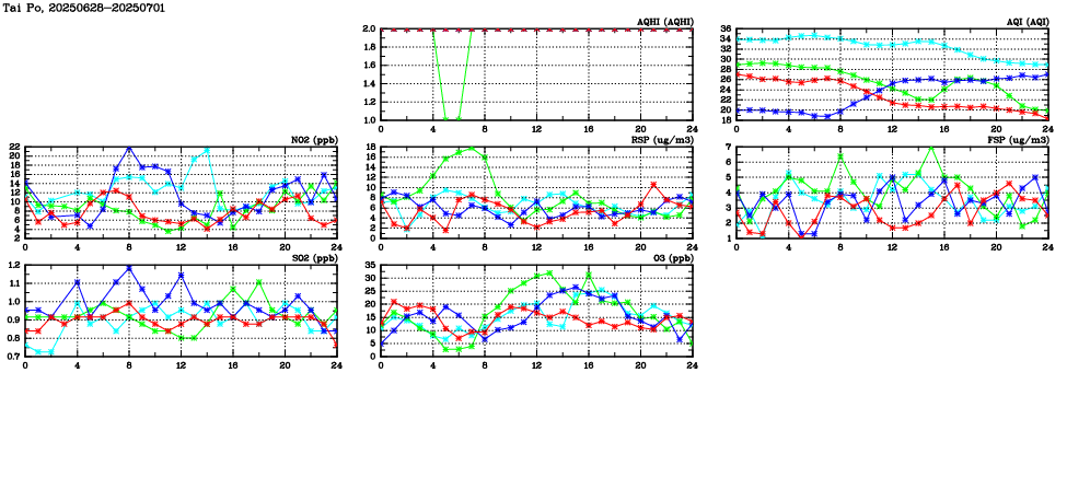 | Air Quality Data Time Series in Tai Po (2025/07/01) | ( Line colors: Day -3 Day -2 Day -1 Current day ) | 2D Map Current AQHI |