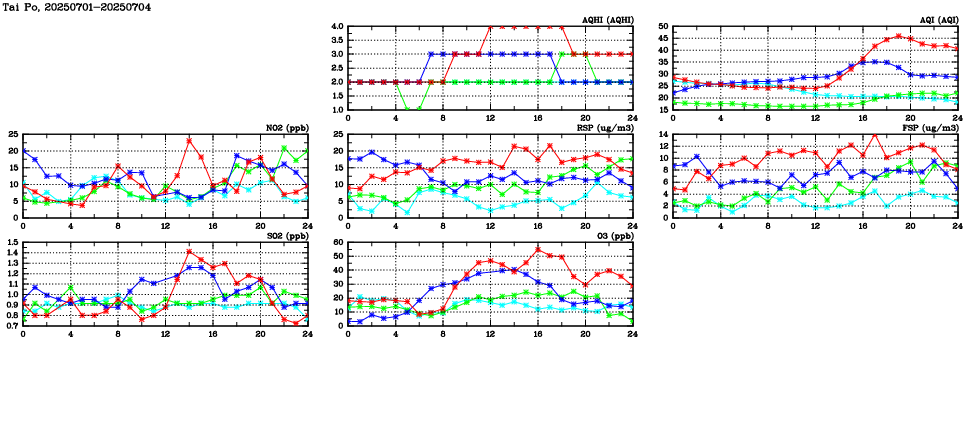 | Air Quality Data Time Series in Tai Po (2025/07/04) | ( Line colors: Day -3 Day -2 Day -1 Current day ) | 2D Map Current AQHI |