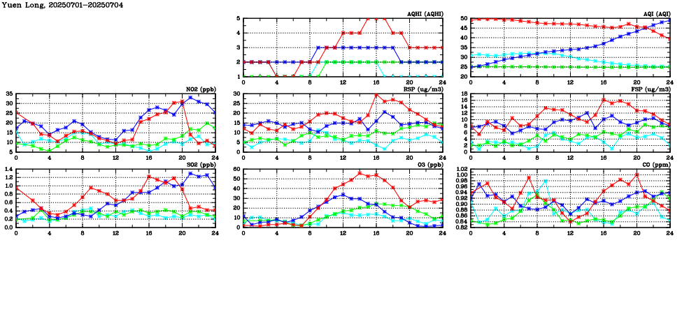 | Air Quality Data Time Series in Yuen Long (2025/07/04) | ( Line colors: Day -3 Day -2 Day -1 Current day ) | 2D Map Current AQHI |