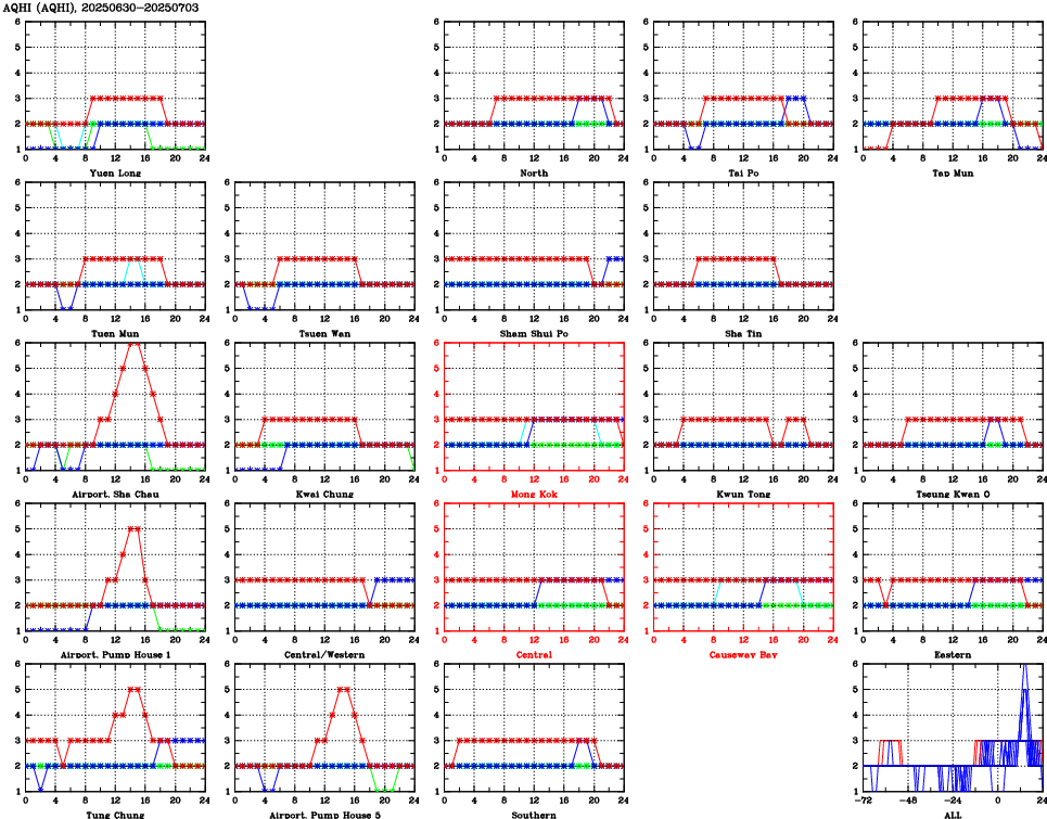 | Air Quality Data Time Series for AQHI (2025/07/03) | ( Line colors: Day -3 Day -2 Day -1 Current day ) | 2D Map Current AQHI |