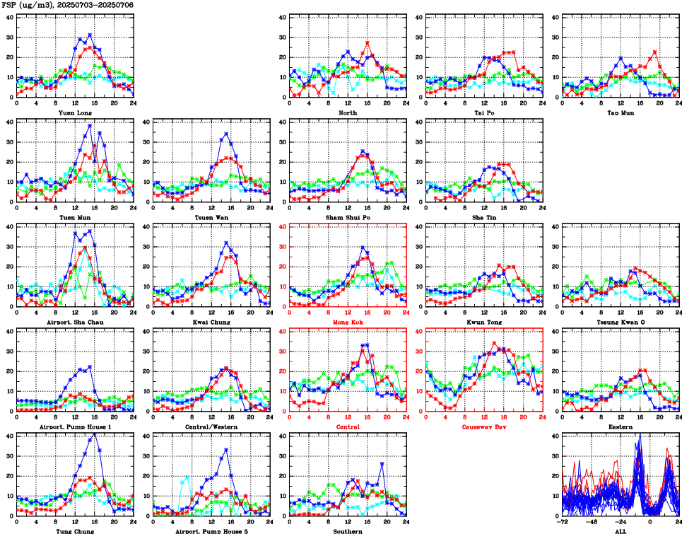 | Air Quality Data Time Series for FSP (2025/07/06) | ( Line colors: Day -3 Day -2 Day -1 Current day ) | 2D Map Current AQHI |