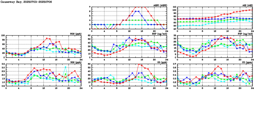 | Air Quality Data Time Series in Causeway Bay (2025/07/06) | ( Line colors: Day -3 Day -2 Day -1 Current day ) | 2D Map Current AQHI |