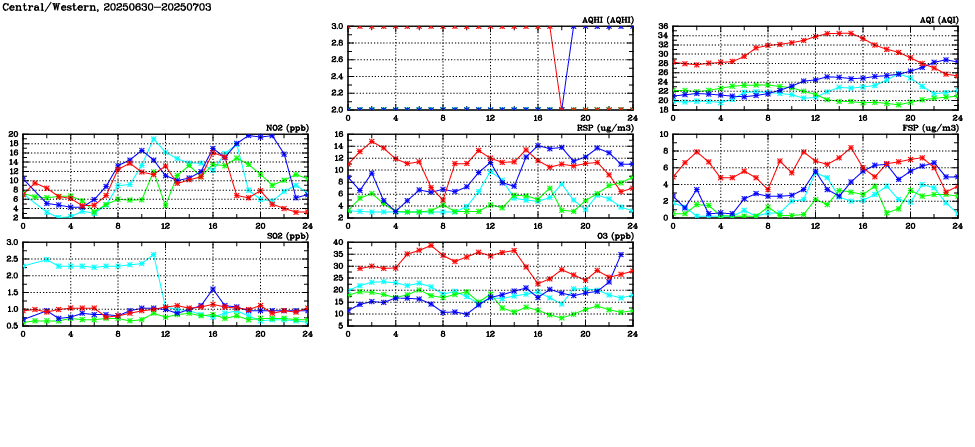 | Air Quality Data Time Series in Central/Western (2025/07/03) | ( Line colors: Day -3 Day -2 Day -1 Current day ) | 2D Map Current AQHI |