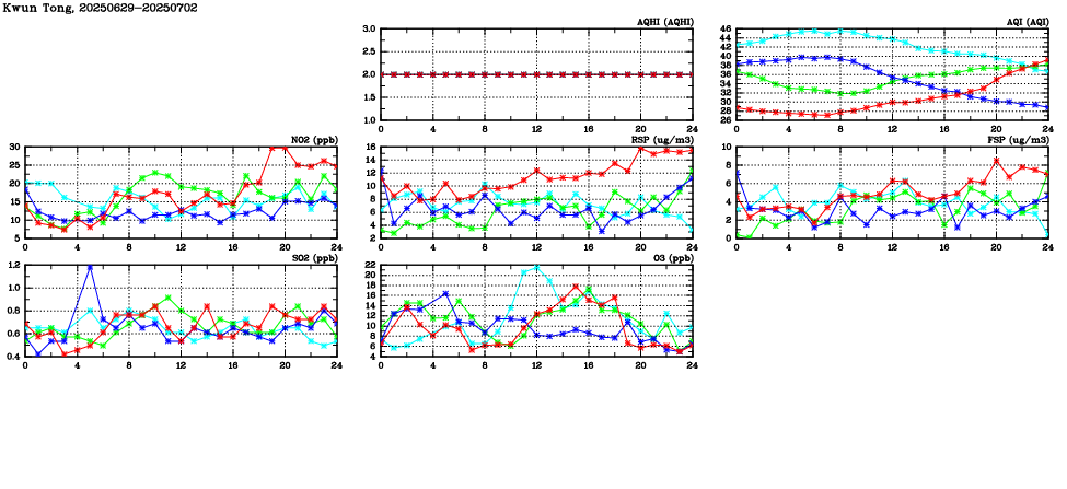 | Air Quality Data Time Series in Kwun Tong (2025/07/02) | ( Line colors: Day -3 Day -2 Day -1 Current day ) | 2D Map Current AQHI |