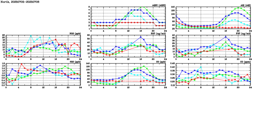 | Air Quality Data Time Series in North (2025/07/08) | ( Line colors: Day -3 Day -2 Day -1 Current day ) | 2D Map Current AQHI |
