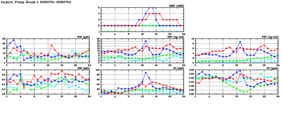 | Air Quality Data Time Series in Airport, Pump House 1 (2025/07/04) | ( Line colors: Day -3 Day -2 Day -1 Current day ) | 2D Map Current AQHI |