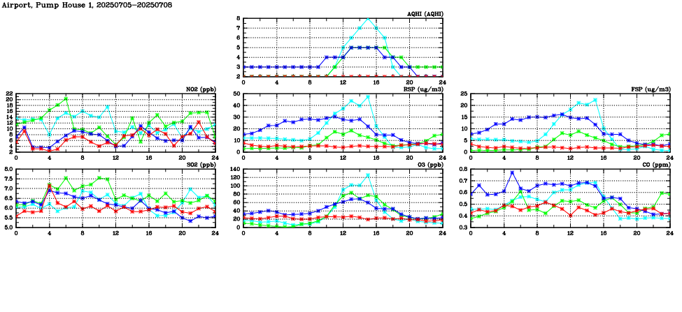 | Air Quality Data Time Series in Airport, Pump House 1 (2025/07/08) | ( Line colors: Day -3 Day -2 Day -1 Current day ) | 2D Map Current AQHI |