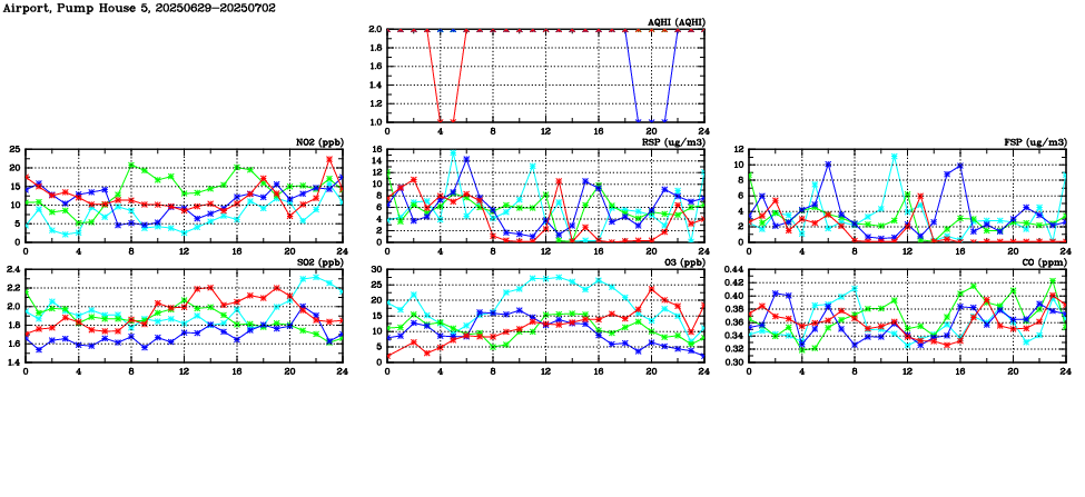 | Air Quality Data Time Series in Airport, Pump House 5 (2025/07/02) | ( Line colors: Day -3 Day -2 Day -1 Current day ) | 2D Map Current AQHI |