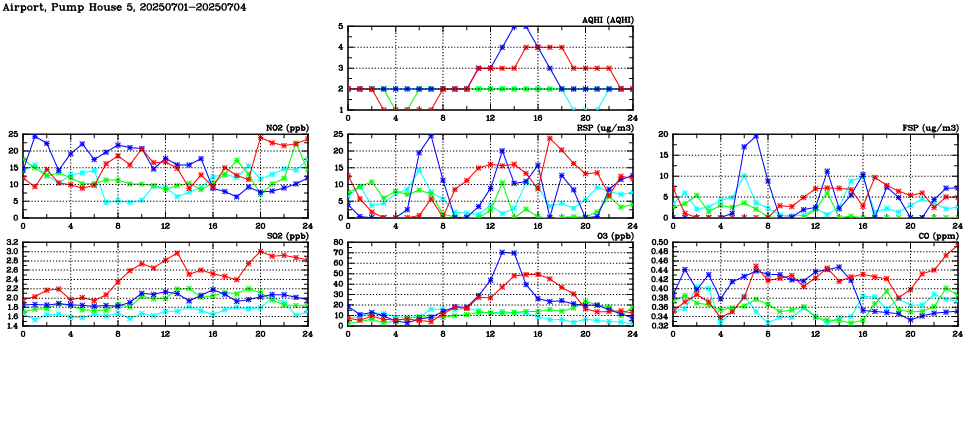 | Air Quality Data Time Series in Airport, Pump House 5 (2025/07/04) | ( Line colors: Day -3 Day -2 Day -1 Current day ) | 2D Map Current AQHI |
