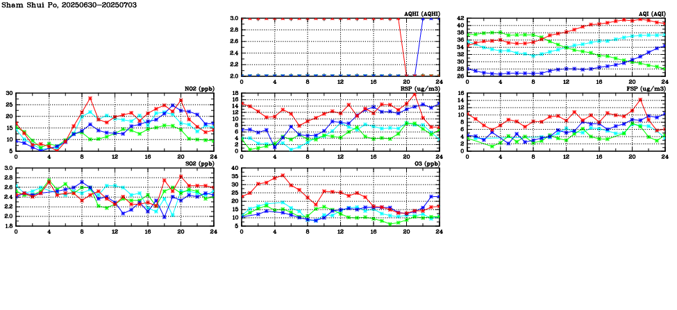 | Air Quality Data Time Series in Sham Shui Po (2025/07/03) | ( Line colors: Day -3 Day -2 Day -1 Current day ) | 2D Map Current AQHI |
