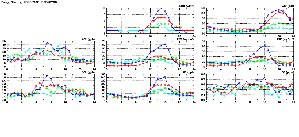 | Air Quality Data Time Series in Tung Chung (2025/07/06) | ( Line colors: Day -3 Day -2 Day -1 Current day ) | 2D Map Current AQHI |