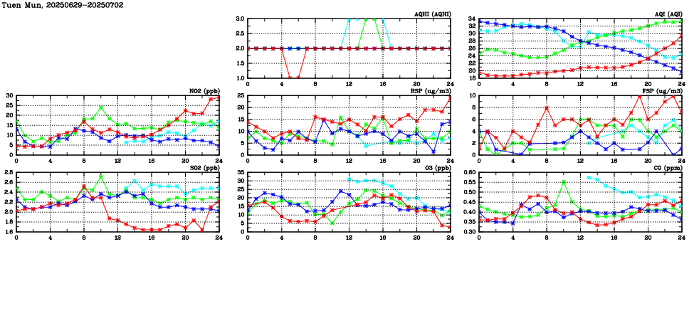 | Air Quality Data Time Series in Tuen Mun (2025/07/02) | ( Line colors: Day -3 Day -2 Day -1 Current day ) | 2D Map Current AQHI |