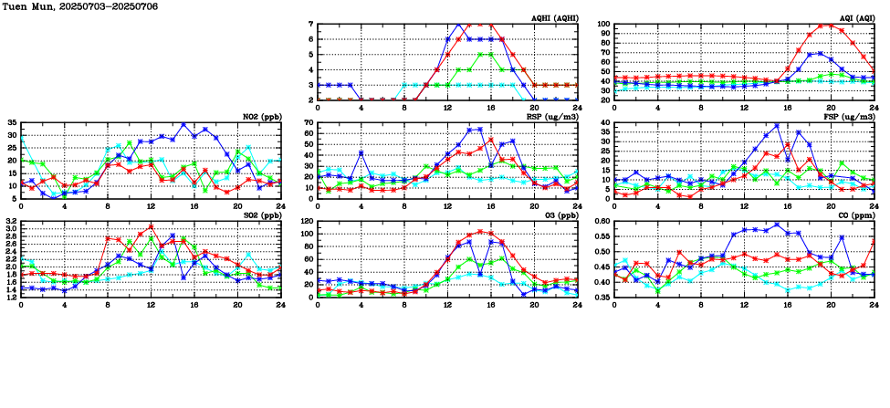 | Air Quality Data Time Series in Tuen Mun (2025/07/06) | ( Line colors: Day -3 Day -2 Day -1 Current day ) | 2D Map Current AQHI |