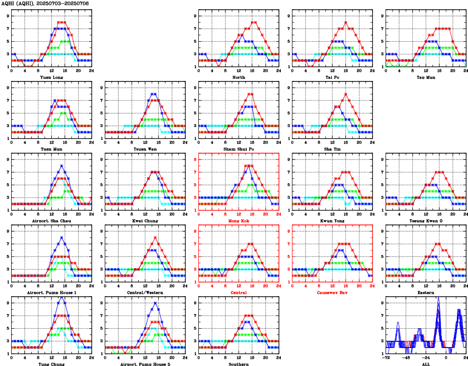 | Air Quality Data Time Series for AQHI (2025/07/06) | ( Line colors: Day -3 Day -2 Day -1 Current day ) | 2D Map Current AQHI |