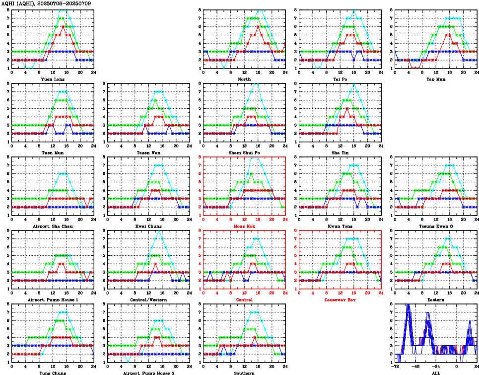 | Air Quality Data Time Series for AQHI (2025/07/09) | ( Line colors: Day -3 Day -2 Day -1 Current day ) | 2D Map Current AQHI |