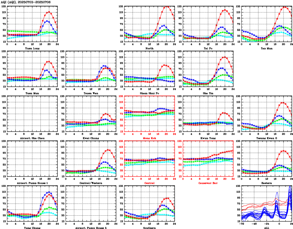 | Air Quality Data Time Series for AQI (2025/07/06) | ( Line colors: Day -3 Day -2 Day -1 Current day ) | 2D Map Current AQHI |