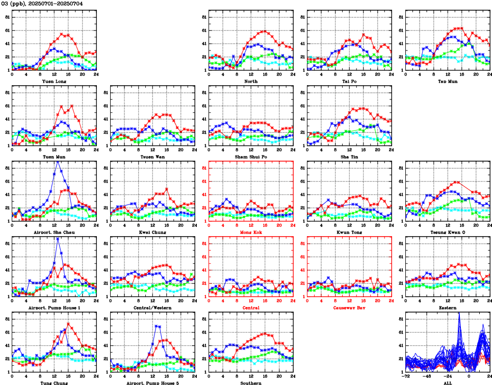 | Air Quality Data Time Series for O3 (2025/07/04) | ( Line colors: Day -3 Day -2 Day -1 Current day ) | 2D Map Current AQHI |
