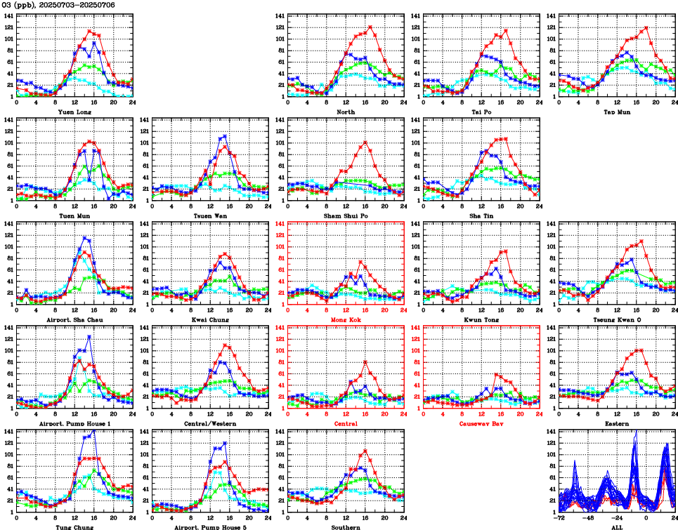 | Air Quality Data Time Series for O3 (2025/07/06) | ( Line colors: Day -3 Day -2 Day -1 Current day ) | 2D Map Current AQHI |