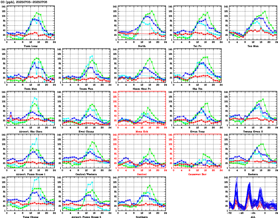 | Air Quality Data Time Series for O3 (2025/07/08) | ( Line colors: Day -3 Day -2 Day -1 Current day ) | 2D Map Current AQHI |