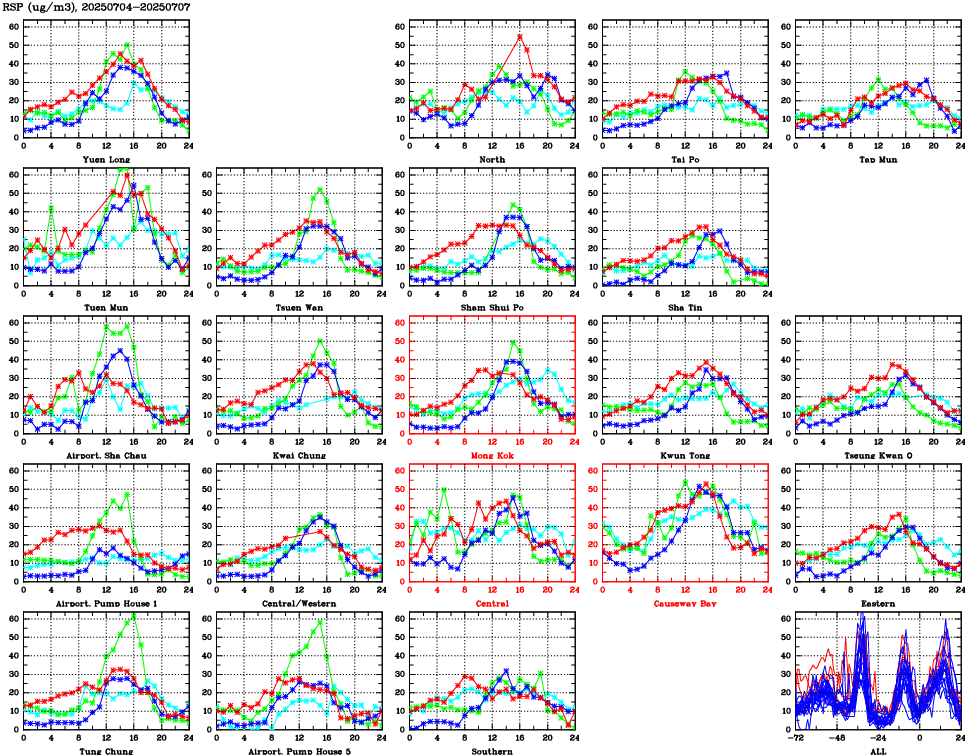 | Air Quality Data Time Series for RSP (2025/07/07) | ( Line colors: Day -3 Day -2 Day -1 Current day ) | 2D Map Current AQHI |