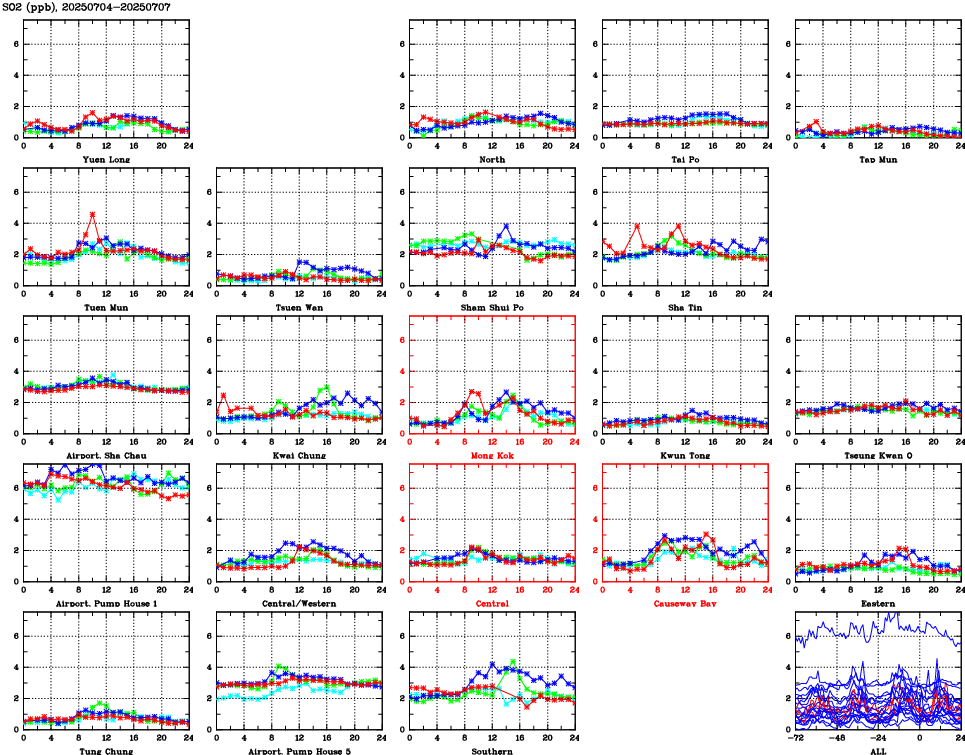 | Air Quality Data Time Series for SO2 (2025/07/07) | ( Line colors: Day -3 Day -2 Day -1 Current day ) | 2D Map Current AQHI |