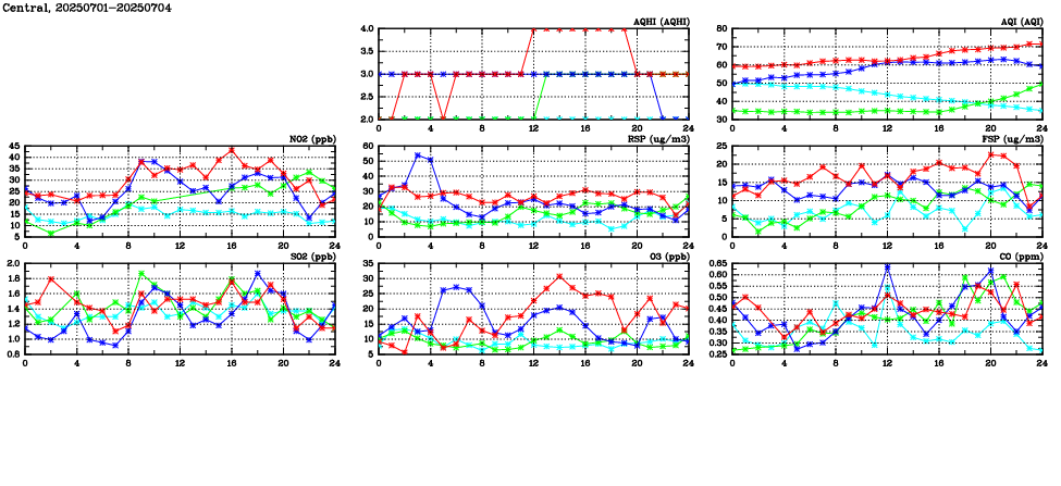 | Air Quality Data Time Series in Central (2025/07/04) | ( Line colors: Day -3 Day -2 Day -1 Current day ) | 2D Map Current AQHI |
