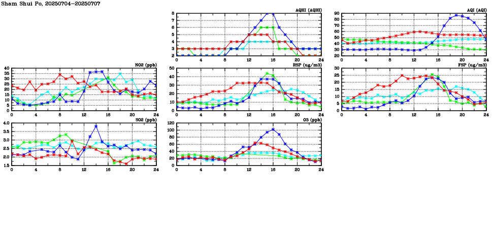 | Air Quality Data Time Series in Sham Shui Po (2025/07/07) | ( Line colors: Day -3 Day -2 Day -1 Current day ) | 2D Map Current AQHI |