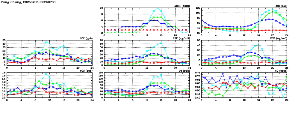 | Air Quality Data Time Series in Tung Chung (2025/07/08) | ( Line colors: Day -3 Day -2 Day -1 Current day ) | 2D Map Current AQHI |