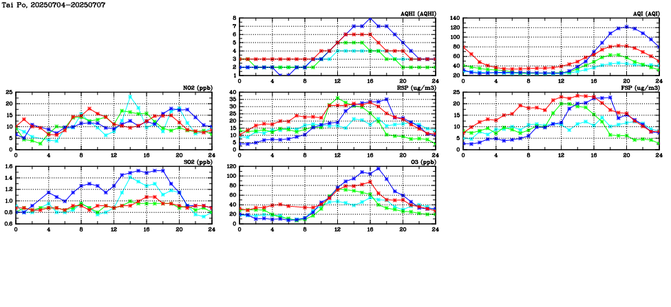 | Air Quality Data Time Series in Tai Po (2025/07/07) | ( Line colors: Day -3 Day -2 Day -1 Current day ) | 2D Map Current AQHI |