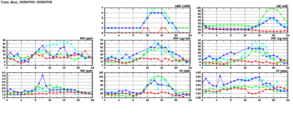 | Air Quality Data Time Series in Tuen Mun (2025/07/08) | ( Line colors: Day -3 Day -2 Day -1 Current day ) | 2D Map Current AQHI |
