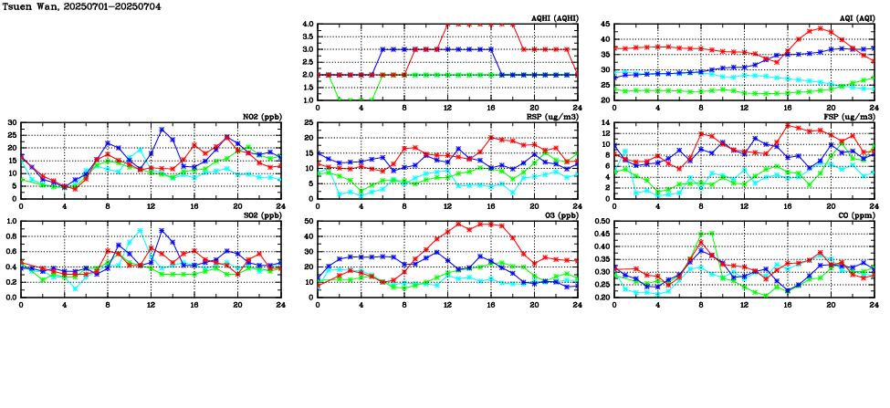 | Air Quality Data Time Series in Tsuen Wan (2025/07/04) | ( Line colors: Day -3 Day -2 Day -1 Current day ) | 2D Map Current AQHI |