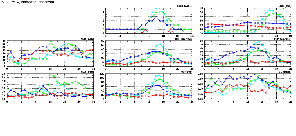 | Air Quality Data Time Series in Tsuen Wan (2025/07/08) | ( Line colors: Day -3 Day -2 Day -1 Current day ) | 2D Map Current AQHI |