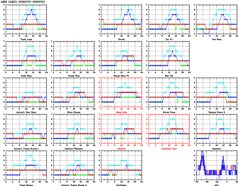| Air Quality Data Time Series for AQHI (2025/07/10) | ( Line colors: Day -3 Day -2 Day -1 Current day ) | 2D Map Current AQHI |