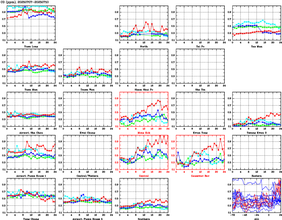 | Air Quality Data Time Series for CO (2025/07/10) | ( Line colors: Day -3 Day -2 Day -1 Current day ) | 2D Map Current AQHI |