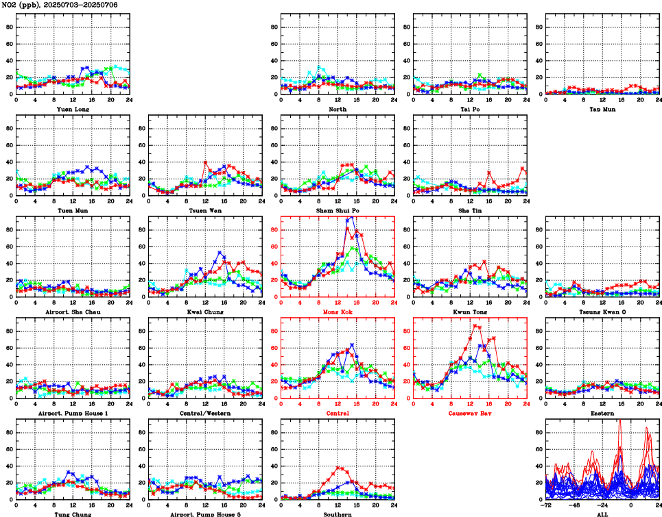 | Air Quality Data Time Series for NO2 (2025/07/06) | ( Line colors: Day -3 Day -2 Day -1 Current day ) | 2D Map Current AQHI |