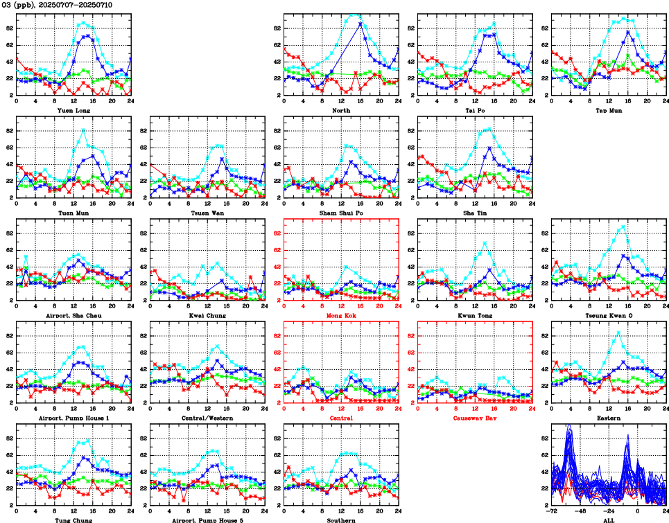 | Air Quality Data Time Series for O3 (2025/07/10) | ( Line colors: Day -3 Day -2 Day -1 Current day ) | 2D Map Current AQHI |