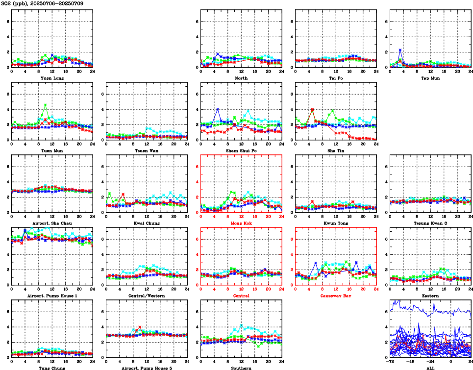 | Air Quality Data Time Series for SO2 (2025/07/09) | ( Line colors: Day -3 Day -2 Day -1 Current day ) | 2D Map Current AQHI |