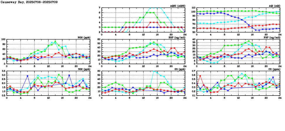 | Air Quality Data Time Series in Causeway Bay (2025/07/09) | ( Line colors: Day -3 Day -2 Day -1 Current day ) | 2D Map Current AQHI |
