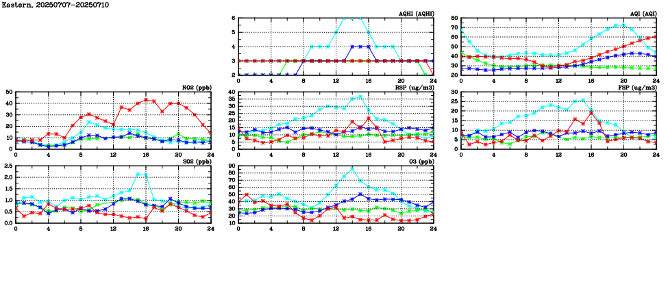 | Air Quality Data Time Series in Eastern (2025/07/10) | ( Line colors: Day -3 Day -2 Day -1 Current day ) | 2D Map Current AQHI |