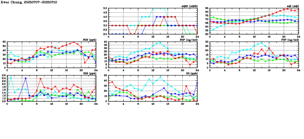 | Air Quality Data Time Series in Kwai Chung (2025/07/10) | ( Line colors: Day -3 Day -2 Day -1 Current day ) | 2D Map Current AQHI |