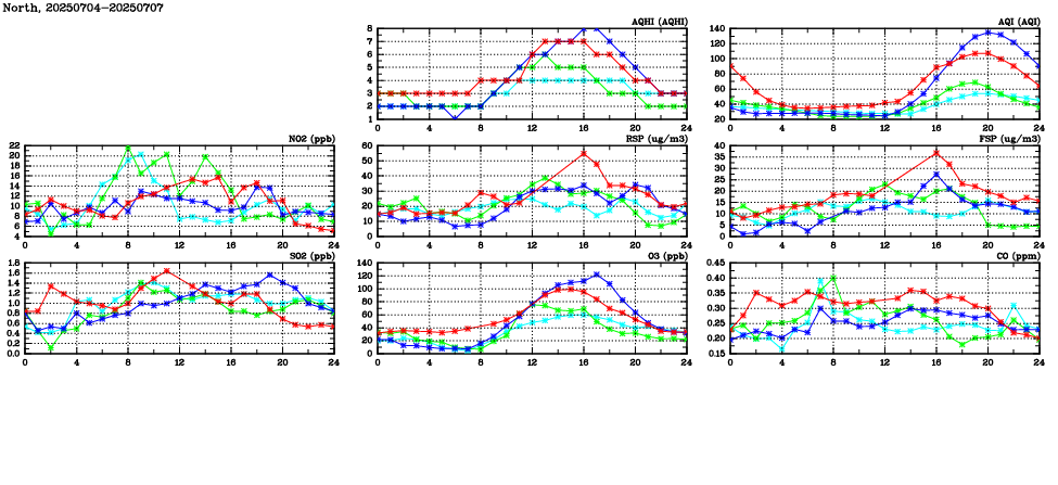 | Air Quality Data Time Series in North (2025/07/07) | ( Line colors: Day -3 Day -2 Day -1 Current day ) | 2D Map Current AQHI |