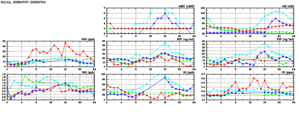 | Air Quality Data Time Series in North (2025/07/10) | ( Line colors: Day -3 Day -2 Day -1 Current day ) | 2D Map Current AQHI |