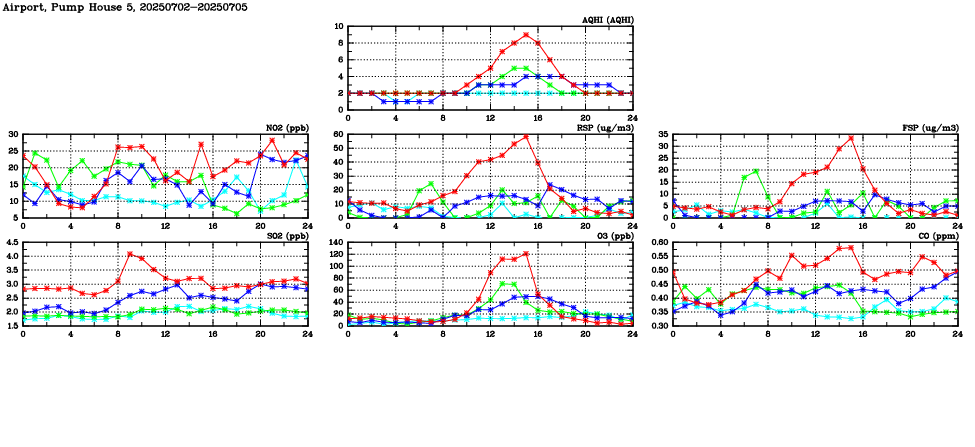 | Air Quality Data Time Series in Airport, Pump House 5 (2025/07/05) | ( Line colors: Day -3 Day -2 Day -1 Current day ) | 2D Map Current AQHI |