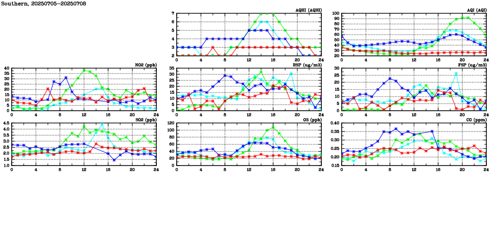| Air Quality Data Time Series in Southern (2025/07/08) | ( Line colors: Day -3 Day -2 Day -1 Current day ) | 2D Map Current AQHI |