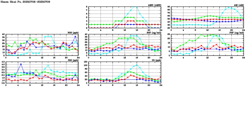 | Air Quality Data Time Series in Sham Shui Po (2025/07/09) | ( Line colors: Day -3 Day -2 Day -1 Current day ) | 2D Map Current AQHI |