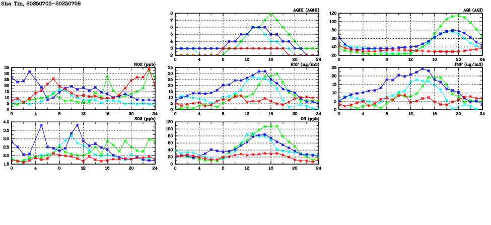 | Air Quality Data Time Series in Sha Tin (2025/07/08) | ( Line colors: Day -3 Day -2 Day -1 Current day ) | 2D Map Current AQHI |